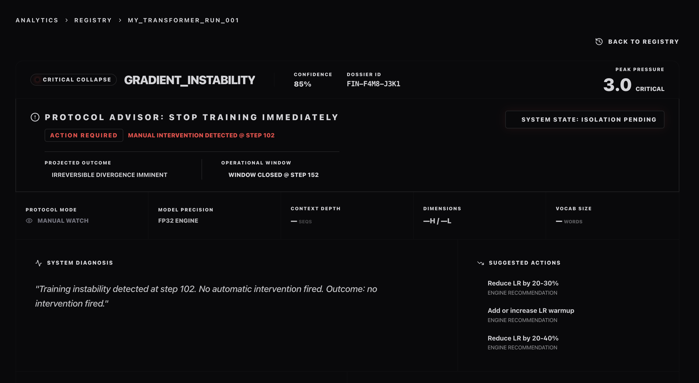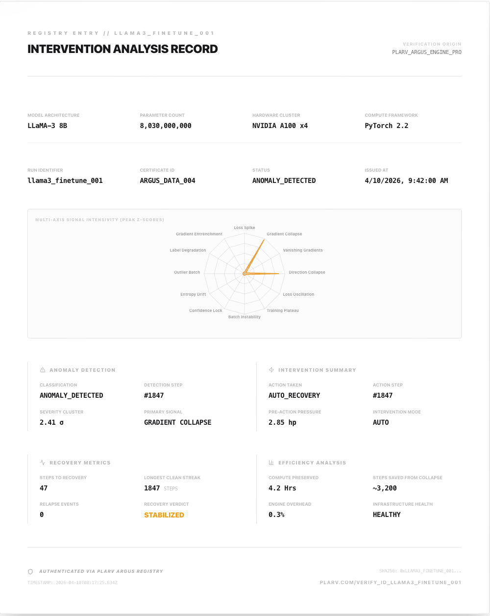 Every run generates a signed certificate of training integrity — a complete record of what happened, what was caught, what was done. Shareable. Auditable. Yours.